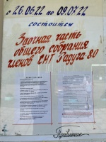 Бюллетень заочной части Уведомление Отчет председателя о работе правления 2021-2022 Акт ревизионной комиссии за период с 01.05.2021 по 30.04.2022 Финансово-экономическое обоснование размера членских взносов 2022-2023 Смета расходов на период с 1 мая 2022 по 30 апреля 2023 Повестка дня отчётно-выборного собрания 2022 Б Ю Л Л Е Т Е Н Ь для голосования участника очного отчетно-выборного собрания 2022 г. Уведомление об отчётно-выборном собрании 2022 года Информация по выносу приборов учёта Наше садоводческое товарищество находится на территории Наро-Фоминского района Московской области. На территории садоводческого товарищества — 267 дачных участков. На территории СНТ находятся: - административное здание (правление, магазин)