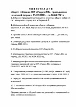 Уважаемые садоводы! В связи с тем, что для проведения общего собрания 10.07.2021 г. не хватило 2(двух) человек для необходимого кворума (129 человек), собрание СНТ пройдет в заочной форме в период с 25.07.2021 г. по 08.08.2021 г. Повестка дня заочного собрания сохраняется в той же редакции. Приносим вам извинения за доставленные неудобства. Правление СНТ